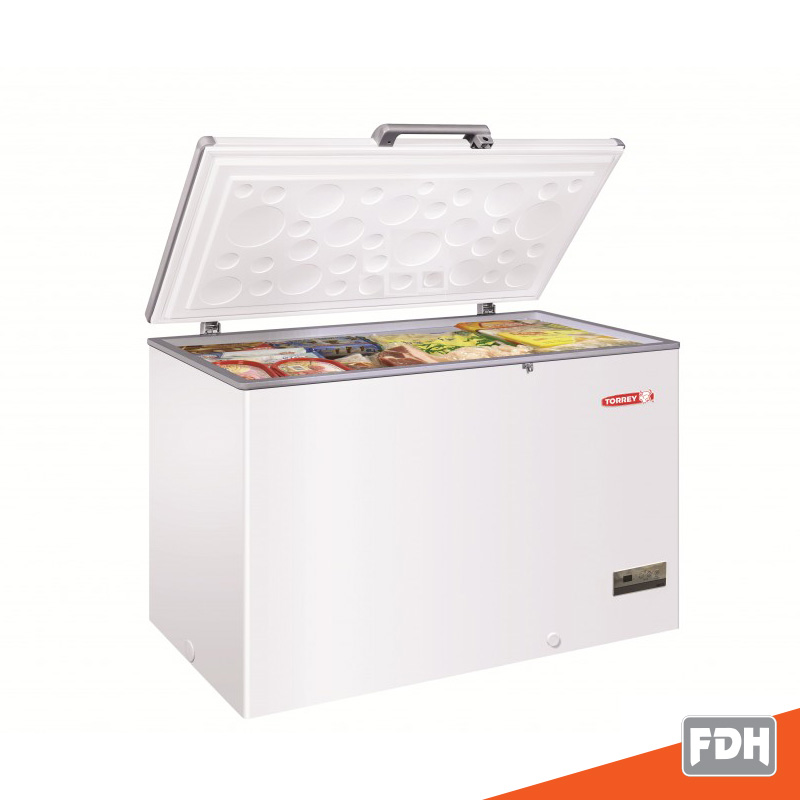 Congelador horizontal TORREY con tapa tipo cofre de 11 pies3 de capacidad, con sistema dual de refrigeración o congelación e interior de acero embozado pintado.