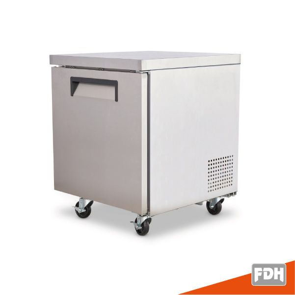 Mesa fría bajo barra de 27 pulgadas, construida en acero inoxidable para mayor durabilidad e higiene. Puede ser utilizado como mesa o isla de trabajo en cocinas, o como un refrigerador bajo barra.