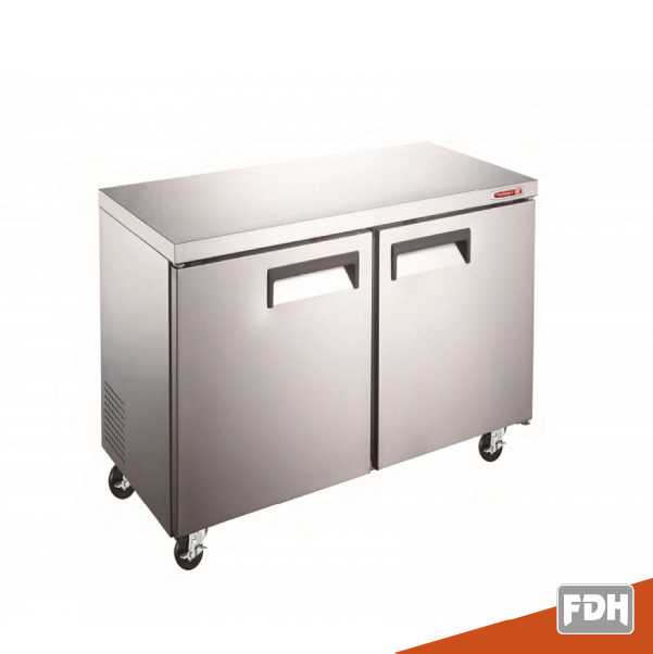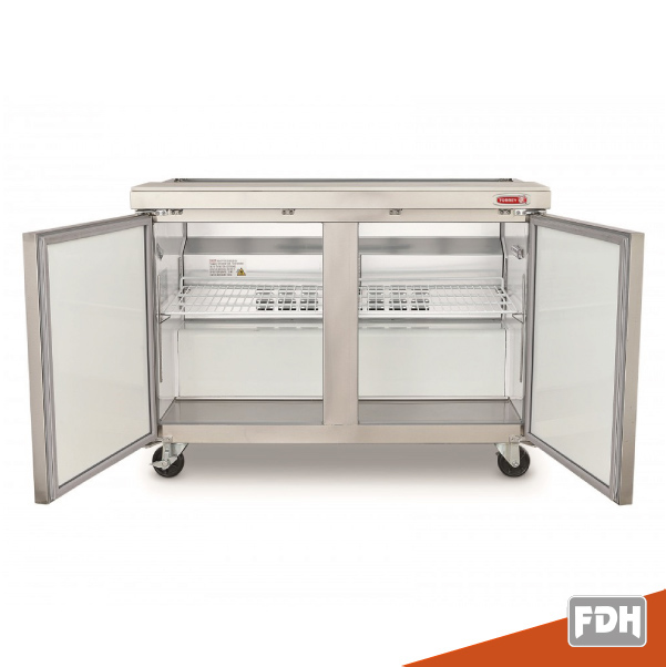 Mesa fría bajo barra de 48 pulgadas, construida en acero inoxidable para mayor durabilidad e higiene. Puede ser utilizado como mesa o isla de trabajo en cocinas, o como un refrigerador bajo barra.