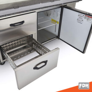 Mesa fría TORREY elaborada en acero inoxidable con placa de granito y 9 insertos de policarbonato de grado alimenticio y almacén y cajones refrigerados