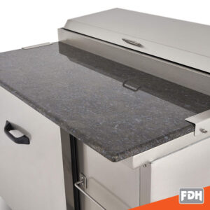 Mesa fría TORREY elaborada en acero inoxidable con placa de granito y 6 insertos de policarbonato de grado alimenticio y almacén refrigerado