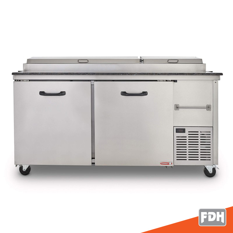 Mesa fría TORREY elaborada en acero inoxidable con placa de granito y 9 insertos de policarbonato de grado alimenticio y almacén refrigerado