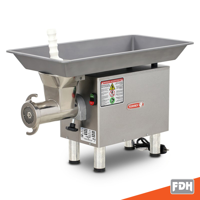 Molino para carne TORREY para mesa, con capacidad de procesamiento de 17.5 Kg por minuto con motor de 2 HP, con cedazos y navajas intercambiables para diferentes aplicaciones