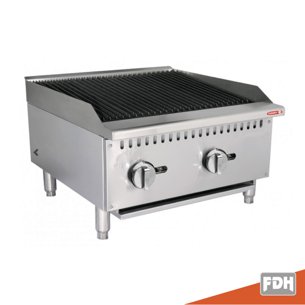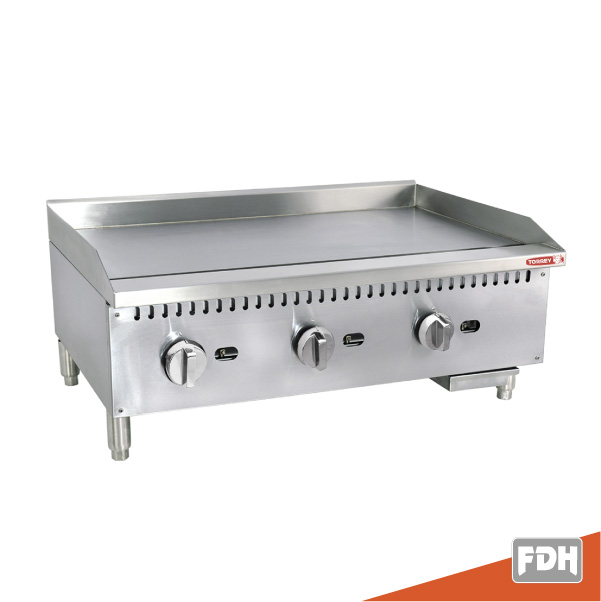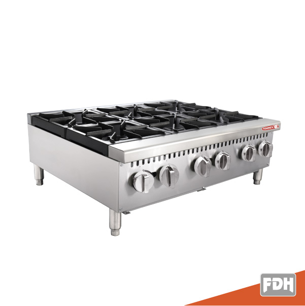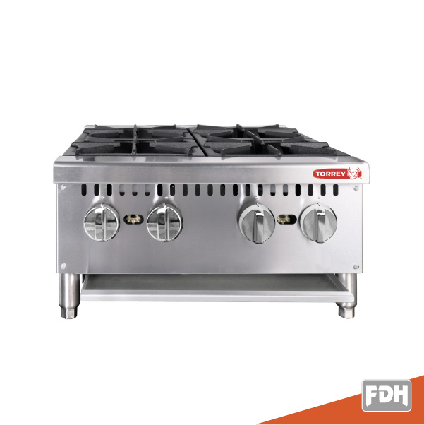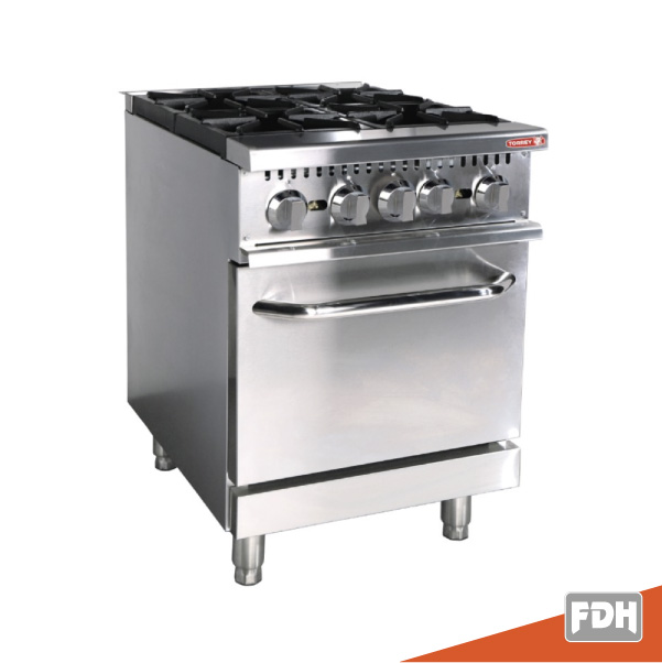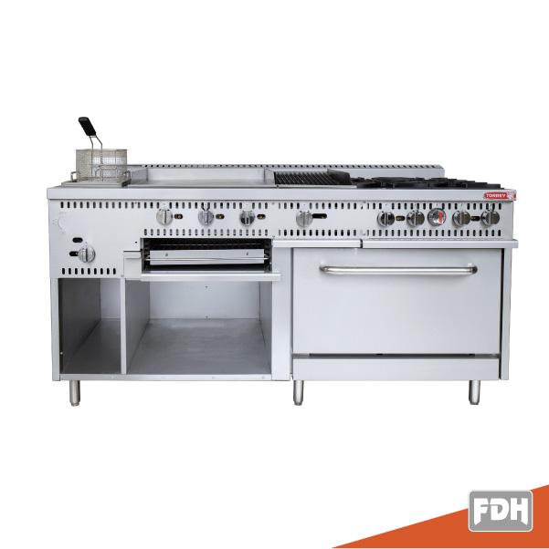 Estufa maestra de gas con parrillas, horno, freidora, plancha, asador y gratinador para solucionar todas tus necesidades de cocción en un sólo equipo integrado.