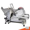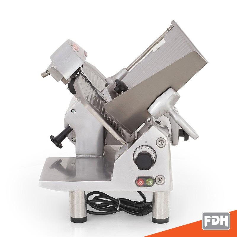 Rebanadora TORREY con transmisión de engranes, ideal para cortar carnes rojas sin hueso, construida en aluminio anodizado y acero inoxidable con cuchilla de 300 mm.