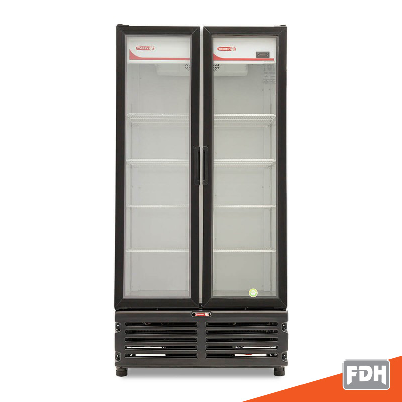Refrigerador refresquero TORREY vertical de 26 pies3, puertas de cristal de alta eficiencia térmica y cierre automático, parrillas de alambre e iluminación LED de alta intensidad.