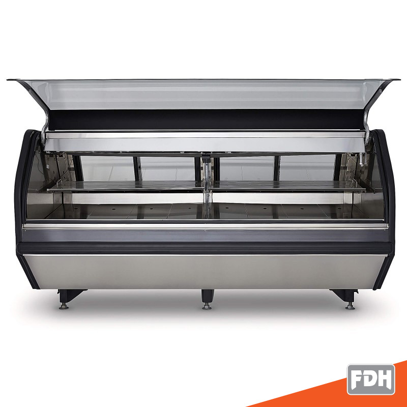 Vitrina carnicera TORREY modular premium de 2.5 m de largo, 100% construida en acero inoxidable, con vidrio frontal abatible que facilita el llenado y limpieza, con puertas posteriores de cristal, almacén inferior para congelamiento, ideal para grandes cadenas de autoservicios y carnicerías grandes.