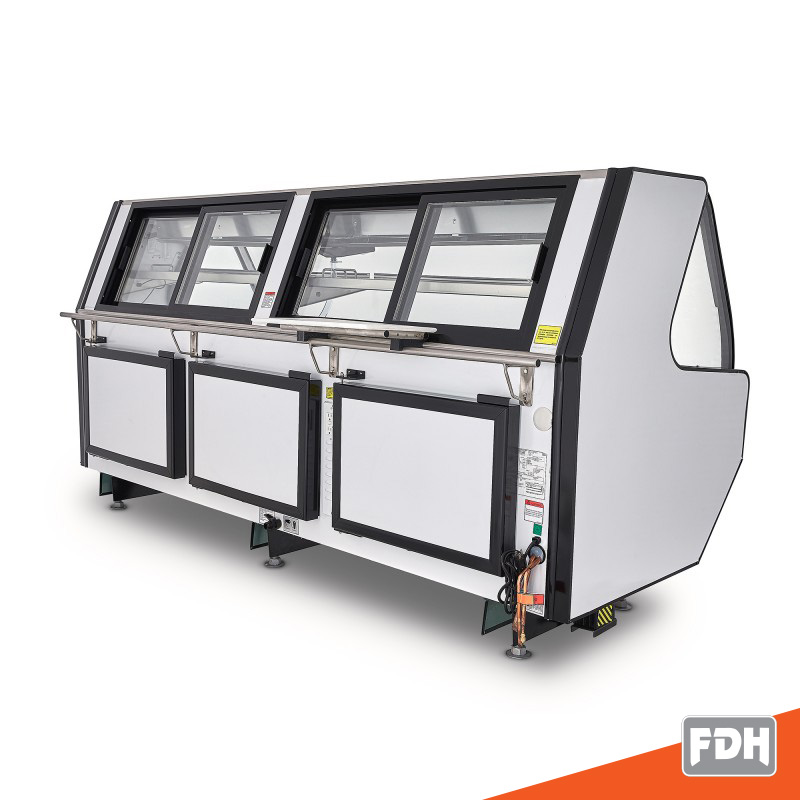 Vitrina carnicera TORREY modular de 2.5 m de largo, con pisos y charolas de exhibición en acero inoxidable, vidrio frontal abatible que facilita el llenado y limpieza, con ventanas laterales y puertas posteriores de vidrio para mayor exhibición. Ideal para grandes cadenas de autoservicios y carnicerías grandes.