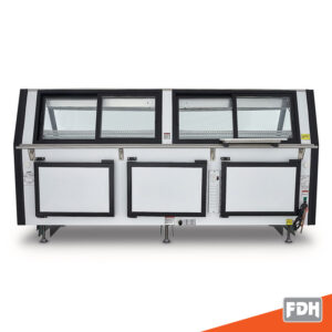 Vitrina carnicera TORREY modular de 2.5 m de largo color blanca, con ventanas laterales de vidrio y puertas posteriores de vidrio para exhibición panorámica, con almacén inferior para congelamiento y techo mostrador, ideal para grandes cadenas de autoservicios y carnicerías grandes.
