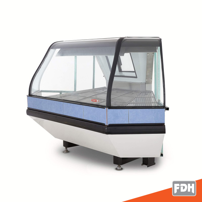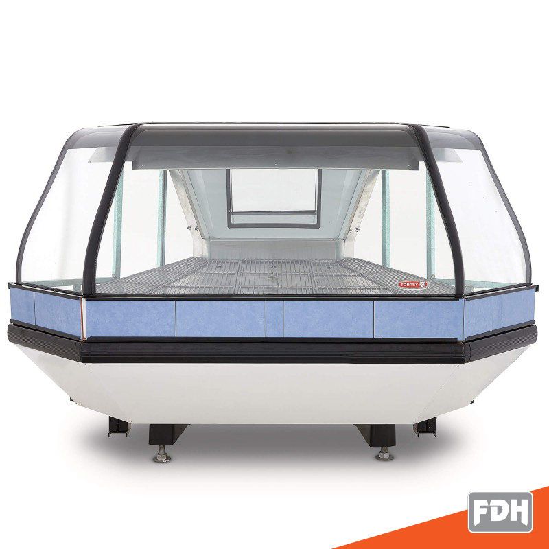 Vitrina esquinera TORREY modular carnicera Torrey de acero inoxidable de 2 m, con puerta posterior de cristal, almacén inferior para congelamiento, ideal para grandes cadenas de autoservicios y carnicerías grandes.