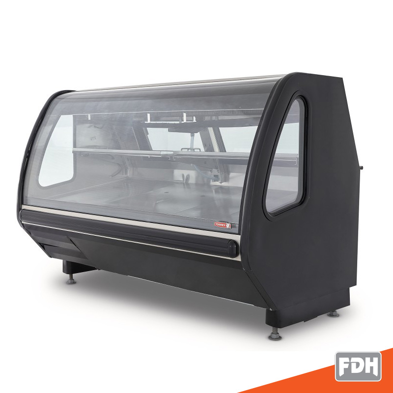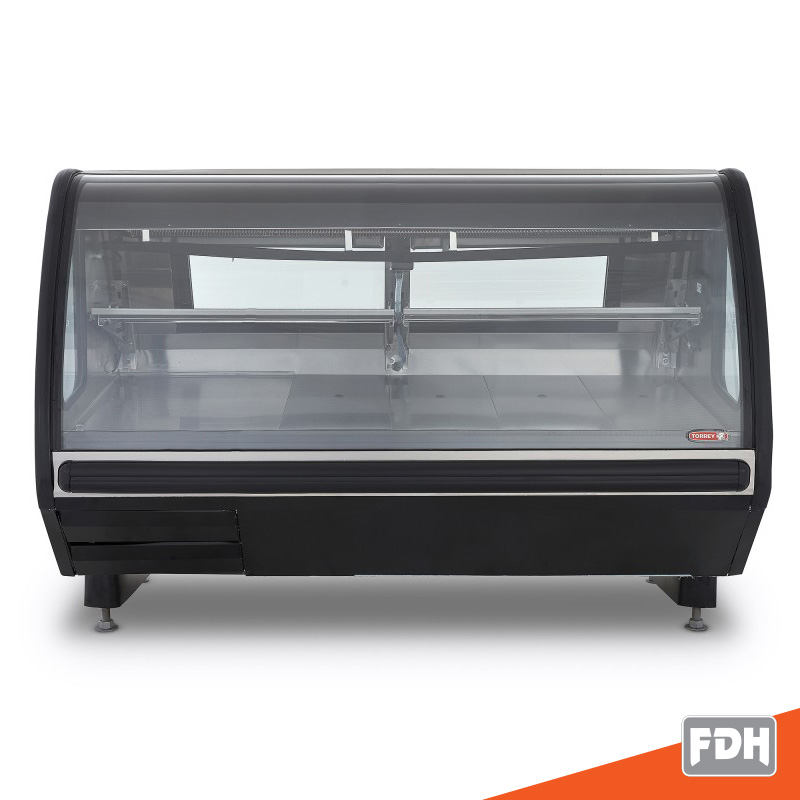 Vitrina carnicera TORREY auto contenida de color negro de 2 m de largo, puertas posteriores de vidrio, congelador inferior ideal para establecimientos grandes de venta de carne.