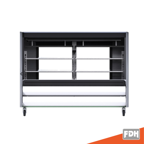 - Cuenta con 4 charolas en acero inoxidable y ofrece 3 niveles de exhibición