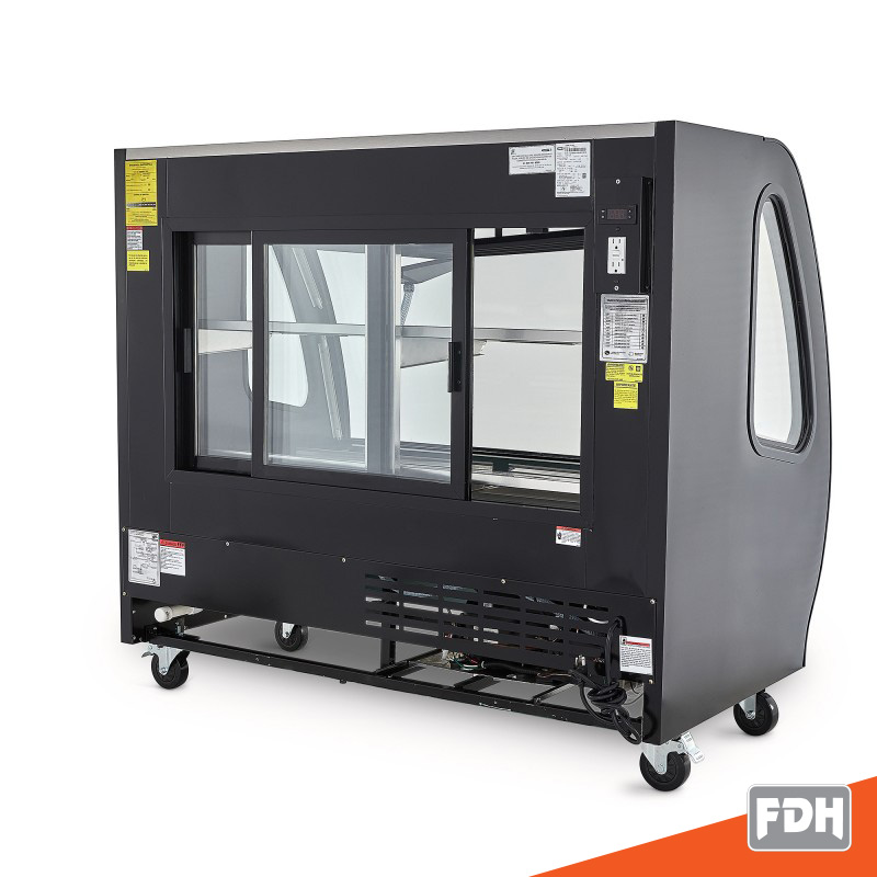 Vitrina TORREY delicatessen color negro de 1.5 m para abarrotes y cremerías de tamaño mediano con dos niveles de exhibición y control digital de temperatura y puertas posteriores de cristal deslizables y desmontables.