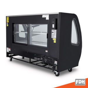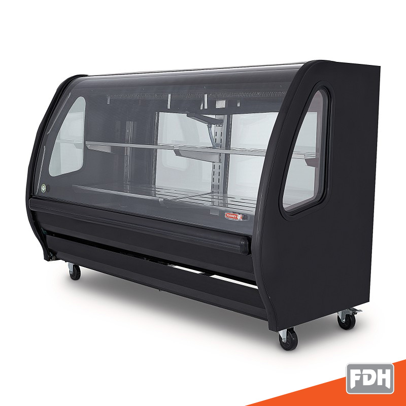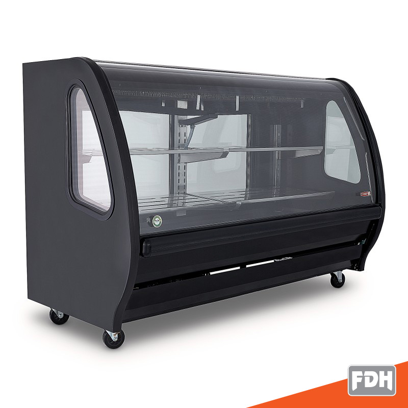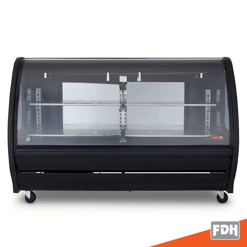 Vitrina TORREY color negro de 1.91 m, 2 niveles de exhibición, control digital de temperatura, puertas posteriores de cristal, techo de acero inoxidable ideal para utilizarla como mostrador dentro de tu establecimiento.